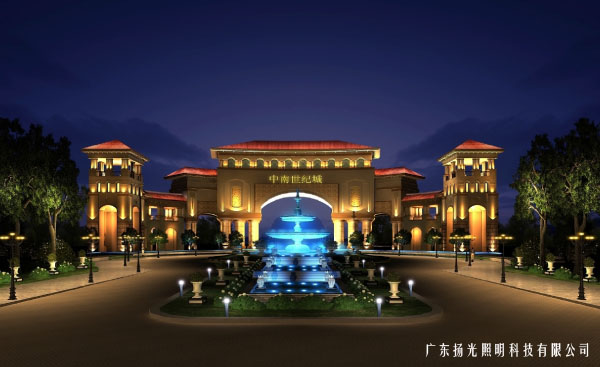 整體燈光體現(xiàn)縱橫的布局,縱軸以水為載體,冷色光為主。橫軸以建筑為載體,暖黃色的燈光,從塔樓兩側(cè)向中心延伸過(guò)度,層次分明的燈光體現(xiàn)大門(mén)的弧形結(jié)構(gòu),寄出標(biāo)志,道路配以歐式庭院燈,整體和諧大氣,溫馨浪漫。