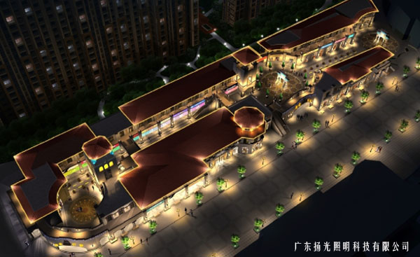 商業(yè)街區(qū)域,層頂運(yùn)用暖色投光燈和光管表現(xiàn)邊緣與輪廓,立面投光燈則體現(xiàn)建筑材質(zhì)的質(zhì)感,廣告燈箱和歐式營(yíng)造出商業(yè)氣息與優(yōu)雅的購(gòu)物空間,整體呈現(xiàn)明暗有序的的燈光層次。廣告牌燈箱由業(yè)主統(tǒng)一監(jiān)制。營(yíng)造整潔而熱烈的商業(yè)氛圍。
