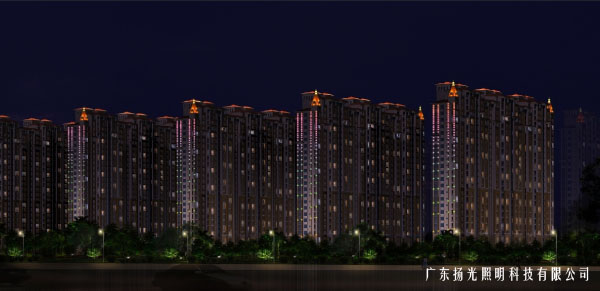 在一期住宅樓區(qū)域,首先打亮八角燈,其次在建筑頂部用洗墻燈,渲染出建筑最頂部塔樓部分,使建筑整體有主有次,呈現(xiàn)別樣的韻味,關(guān)于室內(nèi)部分的燈光,不在設(shè)計(jì)統(tǒng)計(jì)范圍,可根據(jù)業(yè)主,住戶,自由選擇在夜間開(kāi)啟,渲染小區(qū)溫馨舒適的氣息。