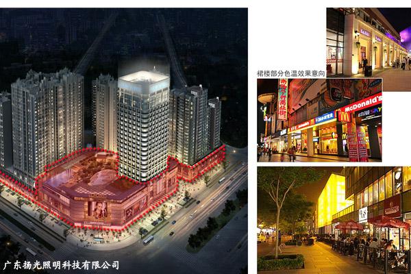 商業(yè)綜合樓立面面對著人流量較多,是燈光靚現(xiàn)的重要區(qū)域。色溫可選用暖黃或彩色光體體現(xiàn)現(xiàn)代時尚感。