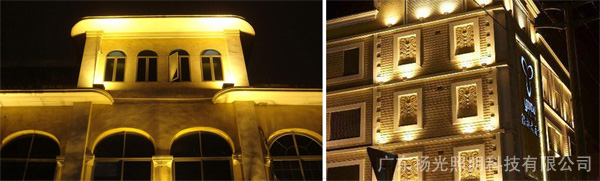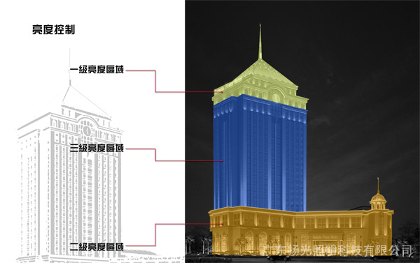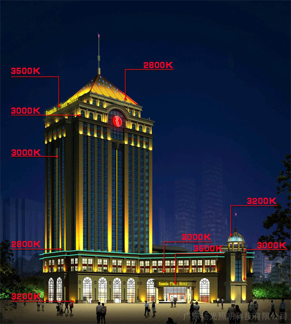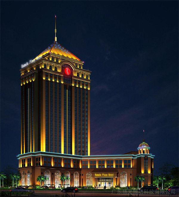 建筑整體以暖色調(diào)為主,頂部多用投光照明體現(xiàn)建筑結(jié)構(gòu)與光感;立面采用埋地?zé)襞c投光燈相結(jié)合的方式營(yíng)造酒店雅致而不失華麗的燈光魅力,褐樓頂部利用藍(lán)色線管勾勒輪廓,使整個(gè)人口燈光注入新穎、活潑的情調(diào)。