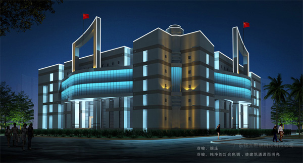 本次設(shè)計(jì)范圍為行政辦公建筑,針對建筑功能特點(diǎn),我們的燈光定位為簡潔、高雅,通過純凈、明亮的燈光,來體現(xiàn)公正、開放、廉明的政府形象。