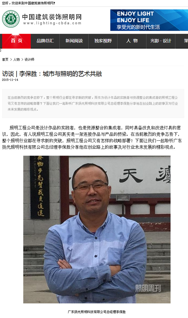 11月14日,《照明周刊》采訪了廣東揚光照明科技有限公司總經(jīng)理李保勝。李總對《照明周刊》記者分享了他創(chuàng)業(yè)路上的故事及公司末來發(fā)展以及行業(yè)的發(fā)展前景。