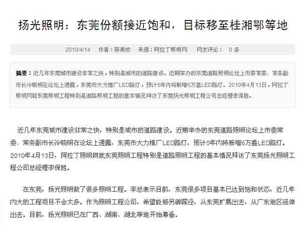 在東莞,揚(yáng)光照明做了很多照明工程。李總表示目前,東莞很多項(xiàng)目基本已達(dá)到飽和狀態(tài),近幾年內(nèi)大的工程項(xiàng)目不會(huì)太多。作為照明工程公司,希望能夠另辟蹊徑,從東莞擴(kuò)展出去,從廣東地區(qū)延伸出去。目前,揚(yáng)光照明已在廣西、湖南、湖北等地開(kāi)始籌備。